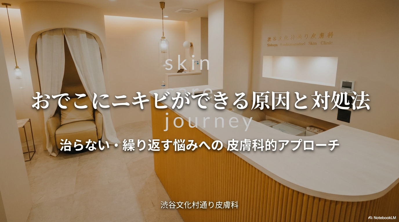 おでこにできるニキビは、皮脂の多さだけで起こる単純なトラブルではありません。皮脂分泌の増加に加えて、毛穴の詰まりや皮膚の菌バランスの乱れ、治療の途中中断が重なることで、治らない状態や再発を繰り返しやすくなります。原因を整理し、保険治療を土台に継続することが、結果的に最も改善につながりやすい方法です。
