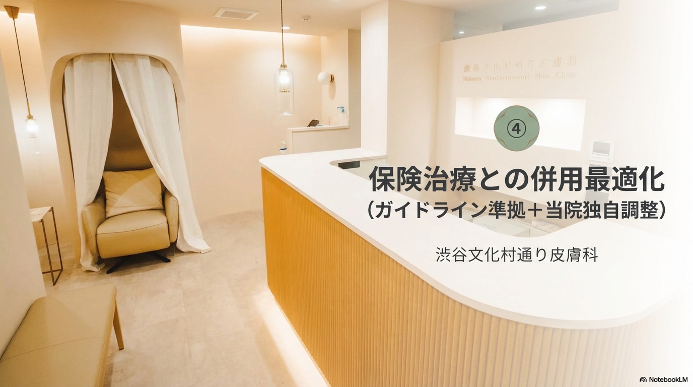 A.治療の軸はガイドラインと同じです。違いは、肌質や部位、刺激の出方に応じて、強さや使い方を細かく調整する点にあります。